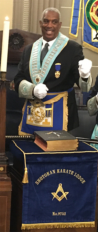 On 14th December 2019 W. Bro. Maj. Joseph Willoughby David Lloyd George Clarke CVO, ADC. PJGD was installed as Worshipful Master of the Shotokan Karate Lodge held at Freemasons Hall Great Queens Street London. W. Bro. David was initiated into Lodge Thistle No. 1014 under the Grand Lodge of Scotland on 25th November 1992 in the land of his native birth, Barbados. He became a joining member of the Shotokan Karate Lodge on 14th February 2004.