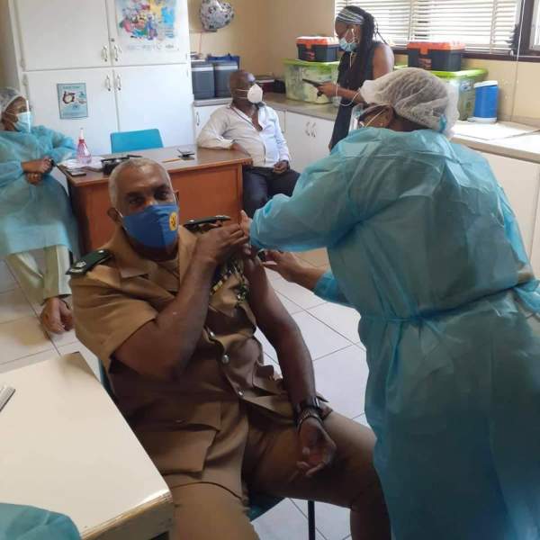 Chief Medical Officer, Dr. Kenneth George, Co-Coordinator of the National COVID-19 vaccine campaign, Major David Clarke, Co-Coordinator of the National COVID-19 vaccine campaign and Dr. Elizabeth Ferdinand, Co-Coordinator of the National COVID-19 vaccine campaign received their first doses of the AstraZenenca vaccine today. Photos credit (PMO's office).