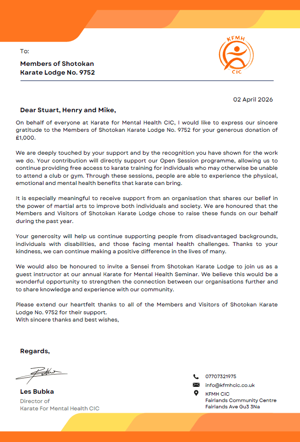 In March 2026, the Shotokan Karate Lodge made a donation of £1,000 to Karate for Mental Health, our Past Master, W Bro Stuart M Dubois’ chosen charity. Karate for Mental Health provides inclusive and accessible karate workshops and physical activity projects across the UK, with a focus on helping individuals from disadvantaged backgrounds or those facing mental and physical health challenges.